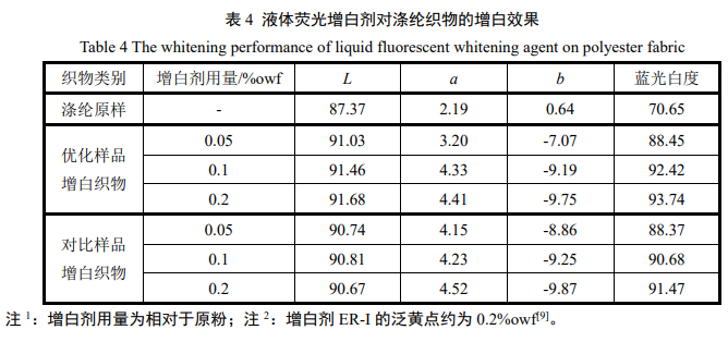 En las condiciones optimizadas, la tasa de residuos centrífugos del sistema de dispersión de abrillantador óptico fue del 59,5 %, y después de reposar durante 74 días, la tasa de residuos del abrillantador óptico en la dispersión fue del 50,5 %, siendo ambos resultados significativamente mejores que la muestra comparativa. Además, el abrillantador óptico líquido optimizado obtenido en este artículo muestra buenos efectos blanqueadores en tejidos de poliéster.
