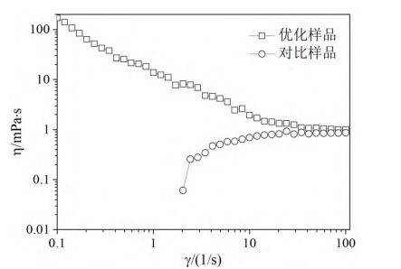 Como se muestra en la Figura 6, las curvas de variación de la viscosidad con la velocidad de corte indican que la muestra optimizada exhibe propiedades reológicas que son drásticamente diferentes de las de la muestra de control. La muestra de control preparada con un dispersante no iónico presenta un espesamiento por cizallamiento, lo que significa que su viscosidad aumenta gradualmente al aumentar la velocidad de cizallamiento. Por el contrario, la muestra optimizada preparada con un superdispersante exhibe un comportamiento de fluido adelgazante, lo que significa que su viscosidad disminuye gradualmente al aumentar la velocidad de corte [10]. En general, la muestra optimizada tiene un valor de viscosidad más alto que la muestra de control.