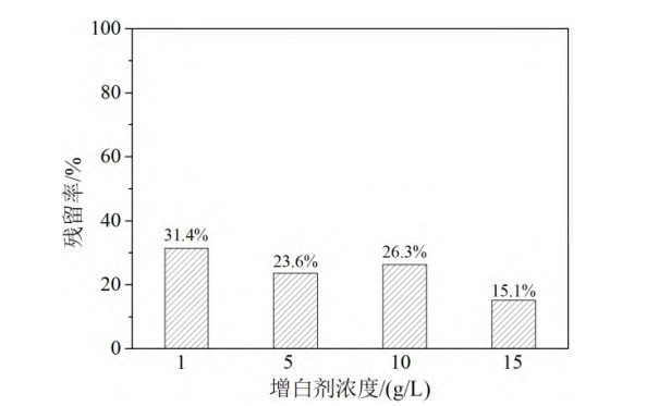 El agente abrillantador se trituró usando un tensioactivo no iónico para obtener dispersiones con diferentes concentraciones de agente abrillantador. Se investigó el efecto de la concentración del agente abrillantador sobre la estabilidad centrífuga de las dispersiones y los resultados se muestran en la Figura 3. Como se muestra en la figura, a medida que la concentración del agente abrillantador en la dispersión aumentó de 1 g/l a 15 g/l, la tasa residual del agente abrillantador disminuyó gradualmente del 31,4 % al 15,1 %. Esto indica que con el aumento de la concentración del agente abrillantador, la distancia promedio entre las partículas del agente abrillantador disminuye, haciendo que las partículas sean más propensas a la agregación y sedimentación.