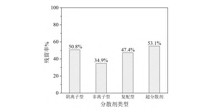 2.1.4 Efecto del tipo de dispersante sobre la estabilidad Se usaron aniónicos, no iónicos, compuestos (aniónicos y no iónicos en una proporción de masa de 1:1) y superdispersantes para moler el agente blanqueador en las mismas condiciones. Se probó la estabilidad centrífuga de las dispersiones resultantes para explorar el efecto del tipo de dispersante sobre la estabilidad. Los resultados se muestran en la Figura 4. Como se muestra en la figura, la dispersión obtenida usando dispersante no iónico en las mismas condiciones tuvo la tasa residual más baja, solo 34,9%. La tasa residual aumentó significativamente cuando se utilizaron dispersantes aniónicos, compuestos o superdispersantes, alcanzando el 47,4%-53,1%. Entre ellos, la tasa residual centrífuga fue la más alta cuando se usó superdispersante, alcanzando el 53,1%. Esto puede deberse a que los grupos aniónicos contenidos en estos dispersantes aumentaron significativamente la repulsión de carga negativa entre partículas, logrando un efecto estabilizador.