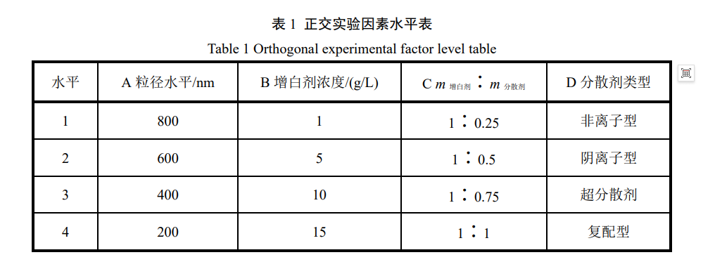 Entre ellos, el blanqueamiento con abrillantadores tiene las ventajas de una dosis baja de abrillantador, un buen efecto blanqueador y un bajo daño a la fibra. Incluso los tejidos blanqueados suelen necesitar un mayor blanqueamiento con abrillantadores. Los abrillantadores fluorescentes tipo estilbeno (ER) son un tipo importante de abrillantador utilizado para tejidos de poliéster. Cuando se comercializan, los fabricantes suelen utilizar métodos de molienda y dispersión para convertirlos en productos líquidos. En la actualidad, la mala estabilidad de la dispersión es un problema importante que afecta el desarrollo de abrillantadores fluorescentes líquidos. Muchos productos relacionados son propensos a la precipitación y sedimentación de partículas sólidas después de haber sido colocados durante varias semanas o meses, lo que da como resultado un efecto de blanqueamiento deficiente en las telas de poliéster e incluso provoca un blanqueamiento desigual, manchas de color, manchas de color y otros defectos en las muestras de tela. Por lo tanto, la investigación y el desarrollo de abrillantadores fluorescentes líquidos altamente estables tienen un valor práctico importante. Este documento toma la agente blanqueador fluorescente ER-I como ejemplo, y utiliza un método de molienda para prepararlo y convertirlo en un agente blanqueador líquido fluorescente. Se investigaron los efectos de factores tales como el tamaño de partícula del agente blanqueador, el tipo de dispersante, la relación entre masa de agente blanqueador y dispersante y la concentración del agente blanqueador sobre la estabilidad del sistema de dispersión. Se diseñó un experimento ortogonal para determinar el grado de influencia de cada factor, con el objetivo de proporcionar una referencia útil para el desarrollo de agentes blanqueadores líquidos fluorescentes altamente estables.