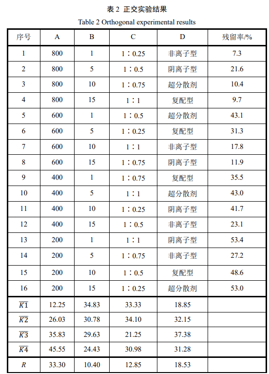 2.2 Diseño experimental ortogonal y análisis de resultados Los resultados de la investigación antes mencionados muestran que el tamaño promedio de partícula del agente blanqueador, el tipo de dispersante, la cantidad de dispersante y la concentración del agente blanqueador tienen un impacto significativo en la estabilidad de la dispersión del agente blanqueador. Para estudiar más a fondo la influencia de cada parámetro en la estabilidad del agente blanqueador líquido, basado en el experimento de un solo factor, se llevó a cabo un diseño experimental ortogonal L16 (44) con factores tales como el nivel de tamaño promedio de partícula (A), la concentración del agente blanqueador (B), la relación de masa del agente blanqueador a dispersante (C) y el tipo de dispersante (D). La tabla experimental ortogonal se muestra en la Tabla 1.