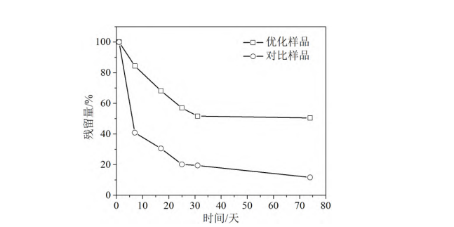 El agente blanqueador líquido fluorescente obtenido en condiciones optimizadas se dejó reposar a temperatura ambiente (25 ± 5 ℃) durante un período de tiempo. Se observó sedimentación y se analizó la cantidad residual de agente blanqueador en la solución. Los resultados se muestran en la Figura 5. Como se muestra en la Figura 5, la muestra optimizada exhibió una mejor resistencia a la sedimentación en comparación con la muestra de control. Después de 74 días, se observó una diferencia de concentración significativa entre las capas superior e inferior de la muestra de control. Las pruebas revelaron que el agente blanqueador residual en la solución de muestra de control era solo del 11,7 %, mientras que el agente blanqueador residual en la solución de muestra optimizada todavía era del 50,5 %. Este resultado indica que la muestra optimizada basada en el superdispersante tiene una estabilidad estática significativamente mejor que el sistema de dispersión no iónico.
