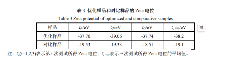 Para revelar el motivo de la mayor estabilidad de la muestra optimizada basada en el hiperdispersante, se midieron los potenciales Zeta de la muestra optimizada y la muestra de control, y los resultados se muestran en la Tabla 3. La Tabla 3 muestra que el potencial Zeta de la muestra optimizada es -38,2 eV, que es casi el doble que el de la muestra de control. Este resultado refleja que el sistema hiperdispersante con numerosos grupos aniónicos puede proporcionar eficazmente fuerzas repulsivas entre las micelas del agente blanqueador, reduciendo así la probabilidad de agregación y sedimentación de las moléculas del agente blanqueador y haciendo que el sistema de dispersión sea más estable.