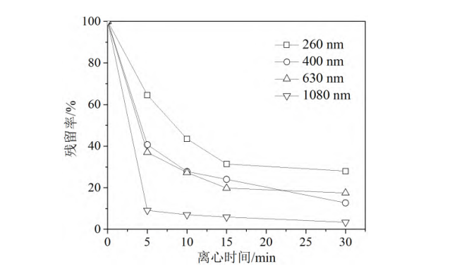 El abrillantador ER-I se trituró utilizando un dispersante no iónico. El tamaño medio de partícula de las partículas en la dispersión abrillantadora obtenida se ajustó controlando el tiempo de molienda. Se obtuvieron dispersiones con tamaños de partícula promedio de 260 nm, 400 nm, 630 nm y 1080 nm [9]. Se probó su estabilidad centrífuga y los resultados se muestran en la Figura 1. Como puede verse en la figura, la tasa residual de abrillantador en la dispersión disminuyó rápidamente dentro de los 15 minutos posteriores a la centrifugación y luego tendió a estabilizarse. Cuanto mayor sea el tiempo de centrifugación, más intensa será la sedimentación de las partículas de abrillantador y menor será la cantidad residual de abrillantador en la dispersión. En las mismas condiciones de tiempo de centrifugación, cuanto mayor sea el tamaño de las partículas de abrillantador, menor será la tasa residual de la dispersión. Esto indica que el sistema de dispersión con tamaño de partícula grande tiene una capacidad más débil para mantener la estabilidad. Por lo tanto, un tamaño de partícula suficientemente pequeño es una condición necesaria para preparar abrillantadores fluorescentes líquidos estables.